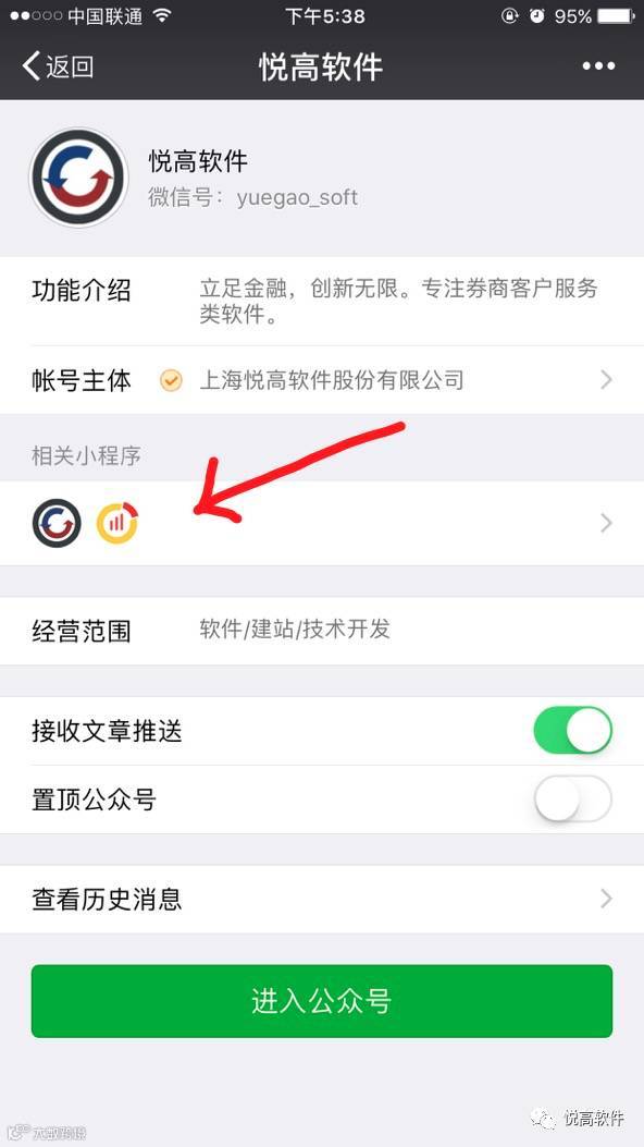 5. 当然,如果您关注过我们的公众号,您也可以在悦高公众号主体信息页面里查看相关的小程序。