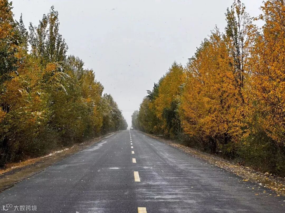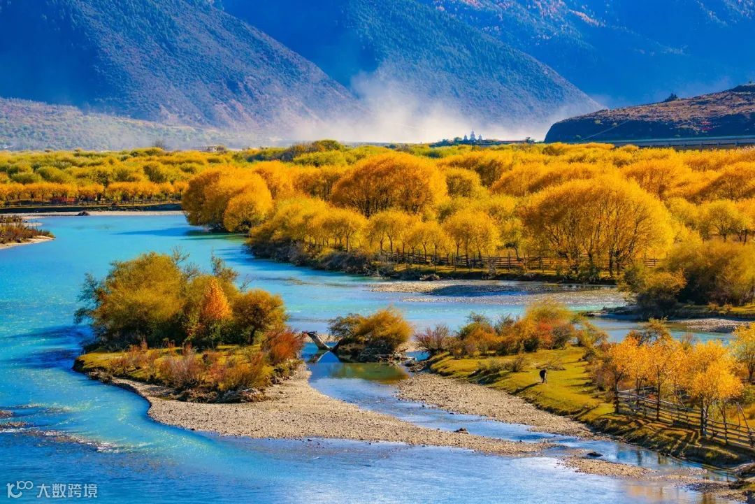 秋天河边一片金黄,与蓝色的河水交相辉映,互成华彩