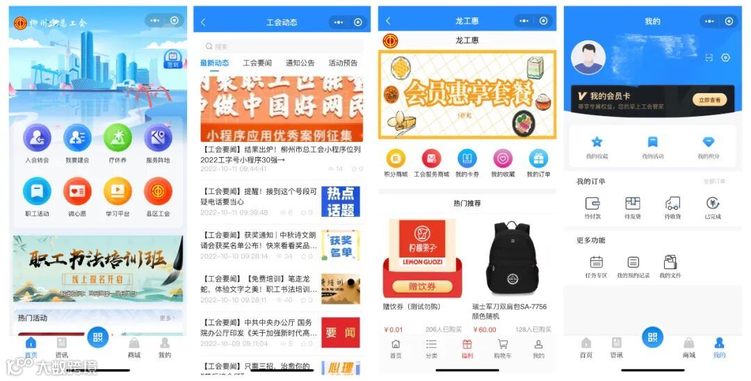 、工会管理、社会组织管理和辅助决策四大维度切入,建立特色工会频道,构建集专业网络、应用系统、电子公文等为一体的网上工会工作平台,并利用大数据、云计算、移动互联网等技术实现工会工作数字化。2022年6月16日,久远银海承建的“柳州市总工会”小程序正式上线。