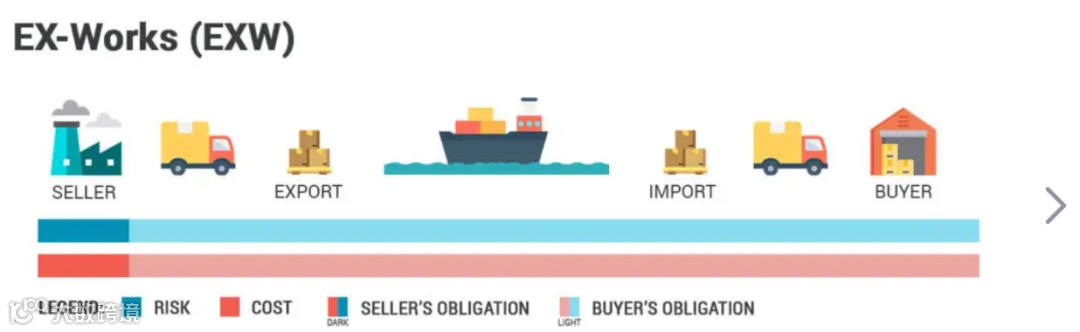 EXW,即工厂交货,是指卖方负有在其所在地(即车间、工厂、仓库等)把备妥的货物交付给买方的责任,但通常卖方不负责将货物装上买方准备的车辆或办理货物结关。买方承担自卖方的所在地将货物运至预期目的地的全部费用和风险。