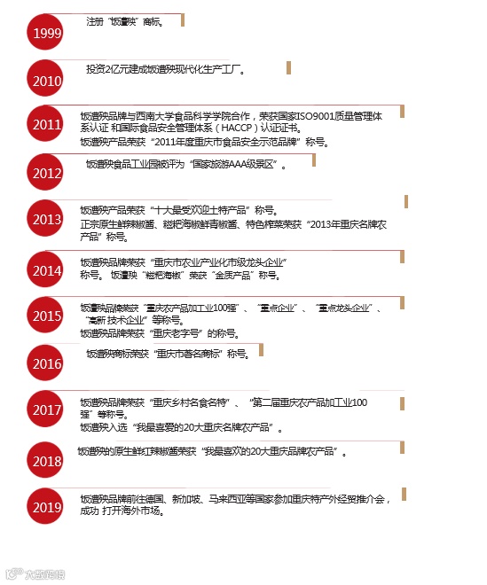 公司注册商标“饭遭殃”获得重庆市著名商标,“饭遭殃”品牌获得食品安全示范品牌等荣誉。“饭遭殃”系列产品还先后荣获重庆名牌农产品、重庆市十佳 农业产业化龙头企业、重庆老字号、中国农产品加工业投资贸易洽谈会金质产品 等多项荣誉。