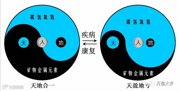 人体是个复杂的巨系统,人体元素由天地合一到天盈地亏,从根本上打破了人体的元素平衡,造成物质、细胞、组织、器官和系统失衡,让人罹患各种疾病。
