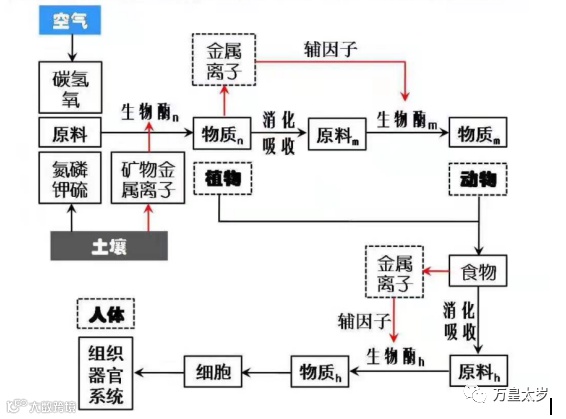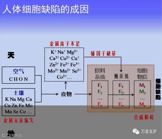 按照物质守恒原理,当秸秆不还田,人、猪和鸡等排泄物不还给土壤……几十年的累积必然导致土壤矿物金属元素流失,造成所生产的食物缺乏金属离子,导致细胞酶系统辅因子缺量和活性酶蛋白缺量,造成细胞物质合成障碍、细胞组成缺陷和细胞功能障碍。
