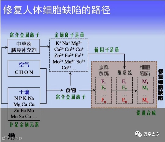 补足土壤流失的矿物金属元素,生产富含矿物金属离子的食物、中草药和膳食补充剂,为细胞物质合成酶蛋白辅因子提供足量的金属离子,激活酶蛋白活性,促进细胞物质合成,保障细胞组成完整和功能正常,修复细胞缺陷,恢复细胞功能,可以开创一条有效预防、控制和康复疾病的新路径。