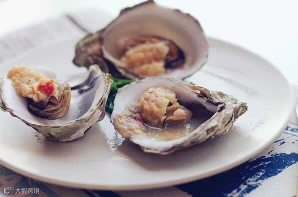 4、在生蚝上撒适量的蒜蓉,入开水锅中蒸5分钟左右即可取出