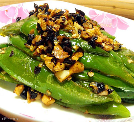 青椒500g、油适量、盐适量、白砂糖1勺、生抽1勺、蒜子5瓣、豆豉5g