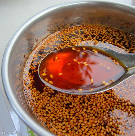 5)等到油温有三成热的时候第三次放辣椒粉,随后放入熟芝麻。三次的辣椒粉等量,晾凉后放入干净的容器中。