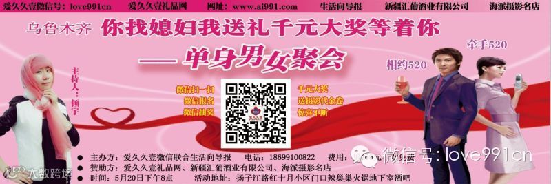 爱久久壹(微信号:love991cn)乌鲁木齐单身交友活动正在进行中,点击标题下“爱久久壹”关注后,回复活动即可报名!看完后记得分享!关注后回复“首页”可抽奖、购物、交友等