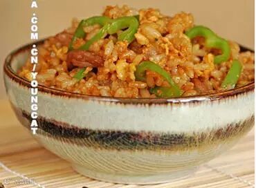 材料(两人份):青椒1个,鸡蛋2个,肉丝100克,姜两片,米饭2碗