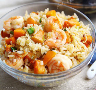 米饭2碗、鲜虾8只、胡萝卜60克、洋葱30克、甜嫩玉米粒50克、豌豆50克、火腿60克。