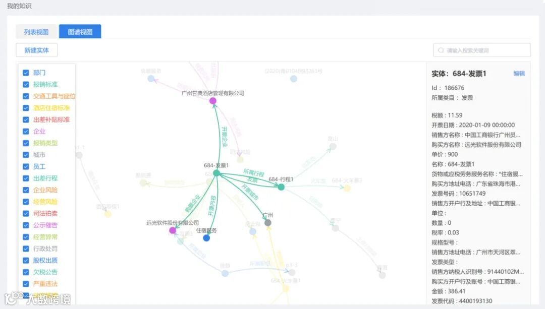 通过远光软件“知识图谱应用平台”的图谱构建模块,可以将审单过程中需要用到的各种实体融合到一张图中,非常直观的定义各类实体间的关系。再通过RPA或外部系统提供的数据接口,将实体所对应的具体数据导入,从而形成我们审单所需要的各类知识。单据中包含了哪些信息,哪些需要被重点关注,在图中一目了然,真正做到了“哪里不清楚点哪里”。最后,将审单规则配置到图谱中,就可以实现报销单的自动审核。