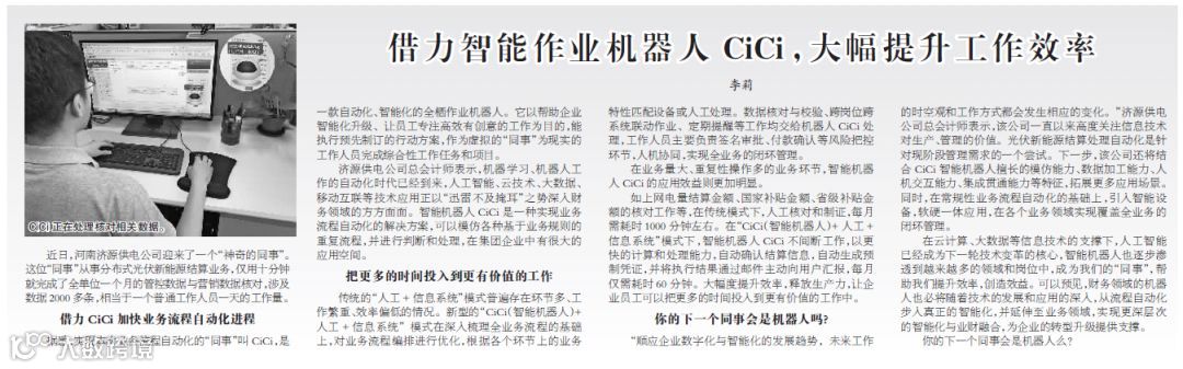 济源供电公司总会计师表示,机器学习、机器人工作的自动化时代已经到来,人工智能、云技术、大数据、移动互联等技术应用正以“迅雷不及掩耳”之势深入财务领域的方方面面。智能机器人CiCi是一种实现业务流程自动化的解决方案,可以模仿各种基于业务规则的重复流程,并进行判断和处理,在集团企业中有很大的应用空间。
