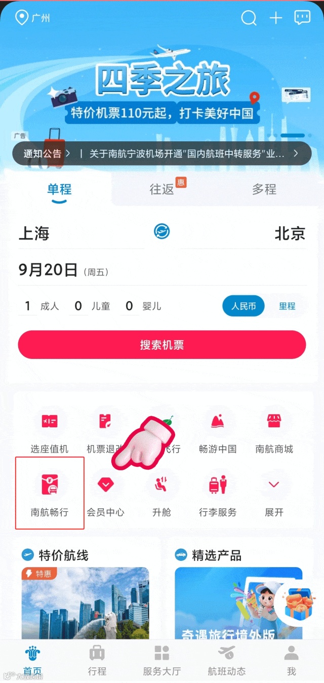 在航班起飞前登录南航APP或小程序首页,点击“南航畅行”