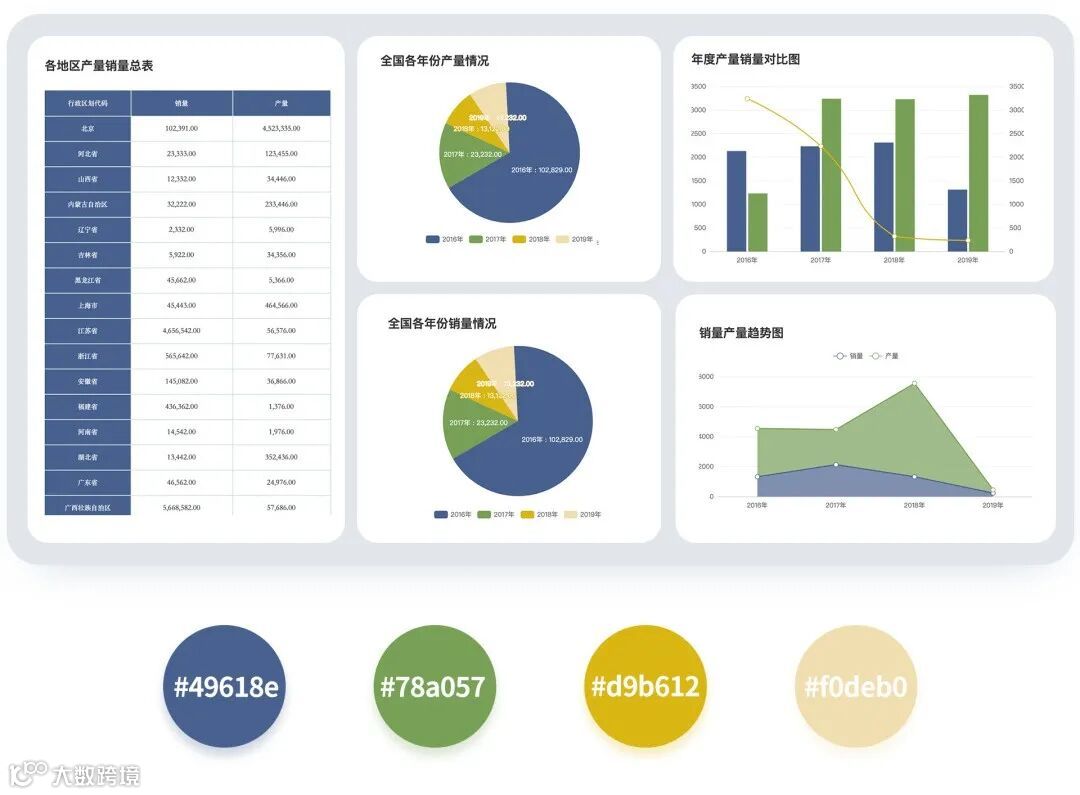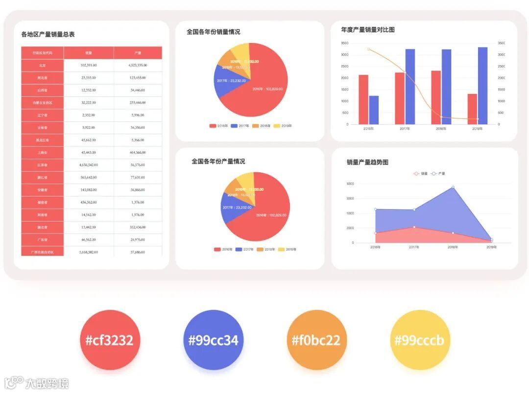 经典一般指具有典范性、权威性的内容。而经典色系是在人们一直以来审美中沉淀下来的,往往是最具有普遍适用性的一种色彩选择偏好,在数据图表中的视觉上具有比较强的冲击力。