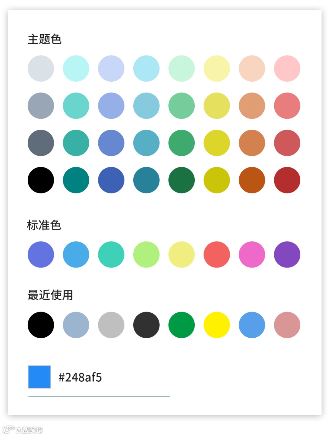 在主题色中,纵列的选择可以决定主题色调;越往下排列,颜色饱和度(不透明度)会越高,同一竖列或相似2-3列是很保险的相似色搭配;最后一行可自主输入色值编号选择想要的颜色。