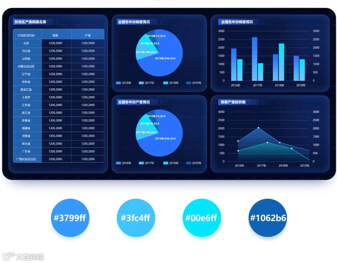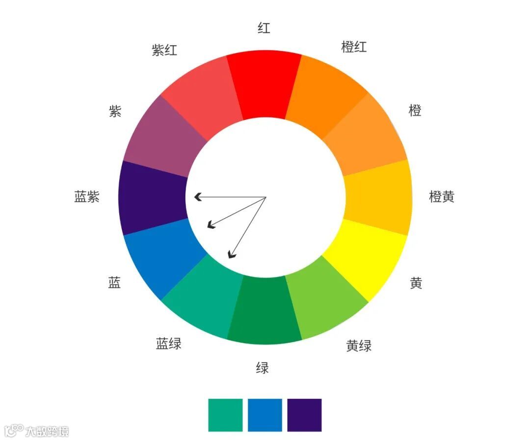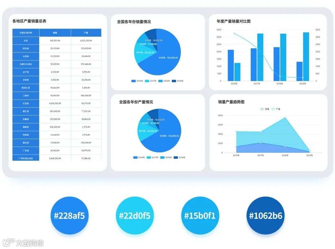 相似色指色轮上相邻的三个颜色,如果搭配合理,可以为你的数据图表制造丰富的质感和层次。比如蓝绿色、蓝色和蓝紫色;还有黄绿色、黄色和橘黄色。使用相似色应该是在数据图表可视化中最常用到的配色思路了,虽然在可辨识度、对比性上比起前两种要稍微弱一些,但却是最不容易出错的配色方案,在数据展示中会体现更高的规范性。