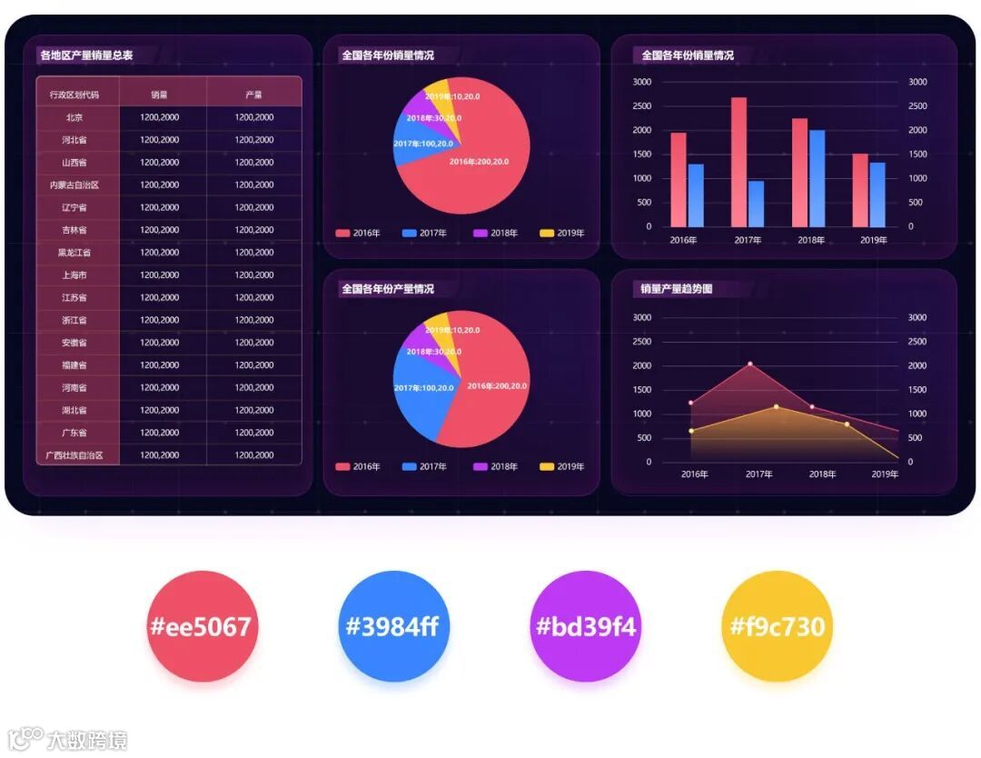 他们的搭配往往很容易形成视觉强对比,非常容易出彩,往往也能出其不意,不同图表的颜色会相互平衡、并相互制约。
