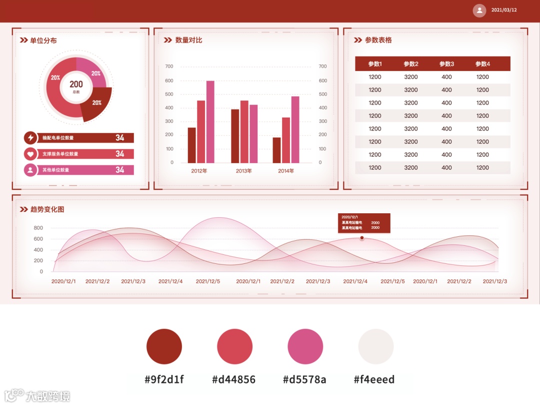 和风的高浓度配色会让整个可视化的数据具有柔和与平静的气氛,加以巧妙的搭配还会有一种分析者在阳光和煦的下午讲述故事的效果,让人感受到舒适温馨。