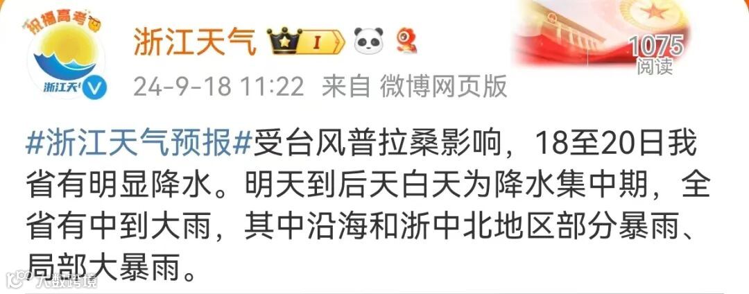 据@浙江天气 最新消息,受台风“普拉桑”影响,18至20日,浙江有明显降水。明天到后天白天为降水集中期,全省有中到大雨,其中沿海和浙中北地区部分暴雨、局部大暴雨。