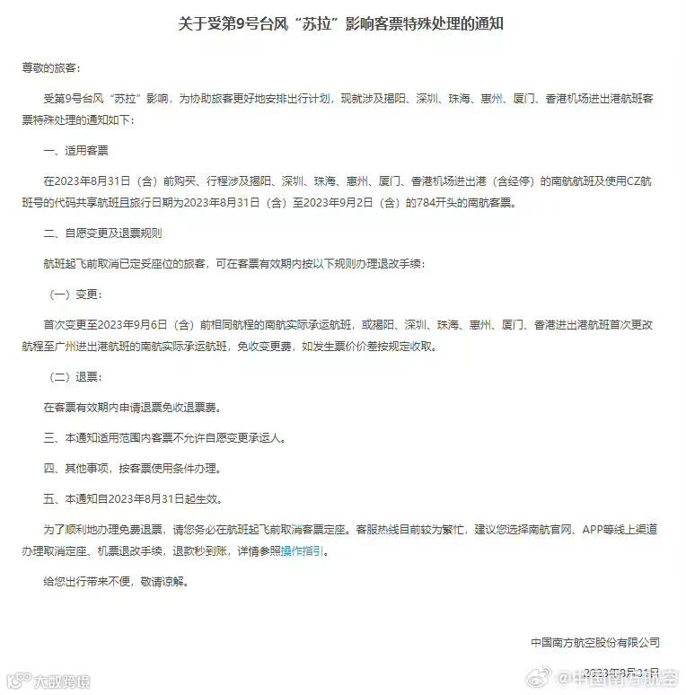 中国南方航空温馨提醒旅客留意航班变动情况及短信通知。您可登录南航官网、南航手机APP、微信公众号、微信小程序,或致电南航客服热线95539查询航班动态,如遇航班延误或取消,也可通过上述渠道免费办理机票退票或改期。客服热线话务繁忙时,建议优先选择网上渠道办理机票退改,以节省您的宝贵时间。