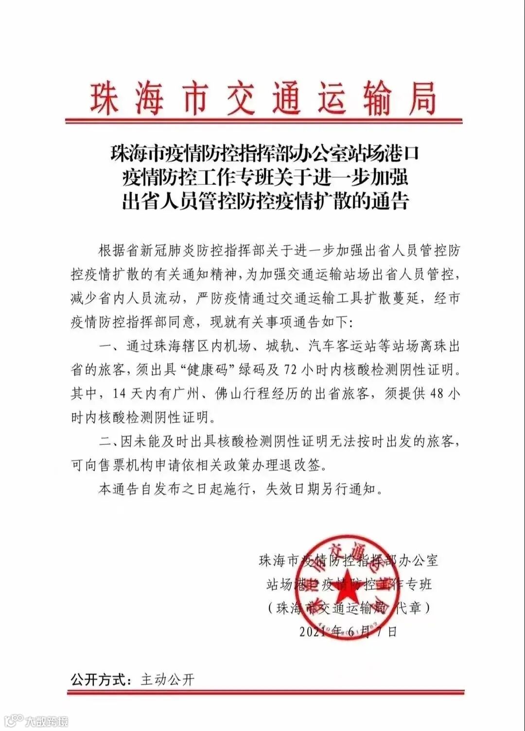 根据省、市疫情防控指挥部通知,为进一步加强出省人员管控,严防疫情扩散蔓延,珠海机场自6月7日起,对所有出港旅客实施“健康码”绿码、行程经历和有效核酸检测阴性证明查验。