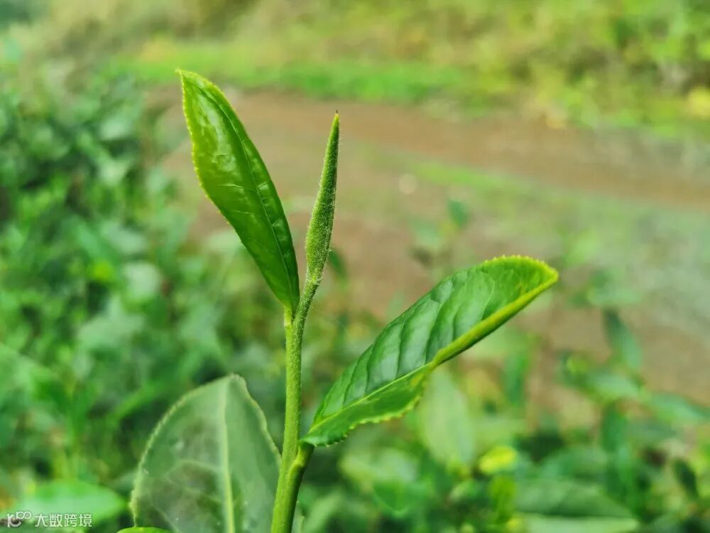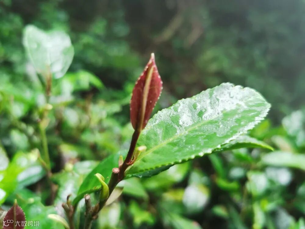 停下脚步,看着眼前的茶树,那平展展的茶树顶上铺满了嫩嫩的绿叶,像刚诞生的婴儿那么娇嫩。尖尖的叶儿时不时的闪着点点亮光,大叶片上一粒粒亮晶晶的水珠往下滚落,像缀满了光灿灿的珍珠一样。