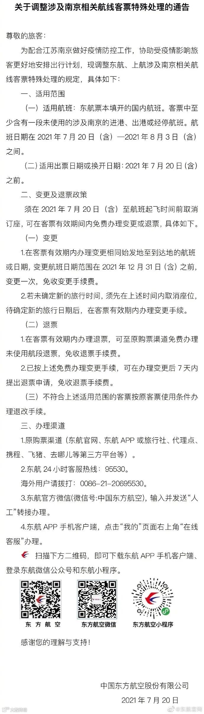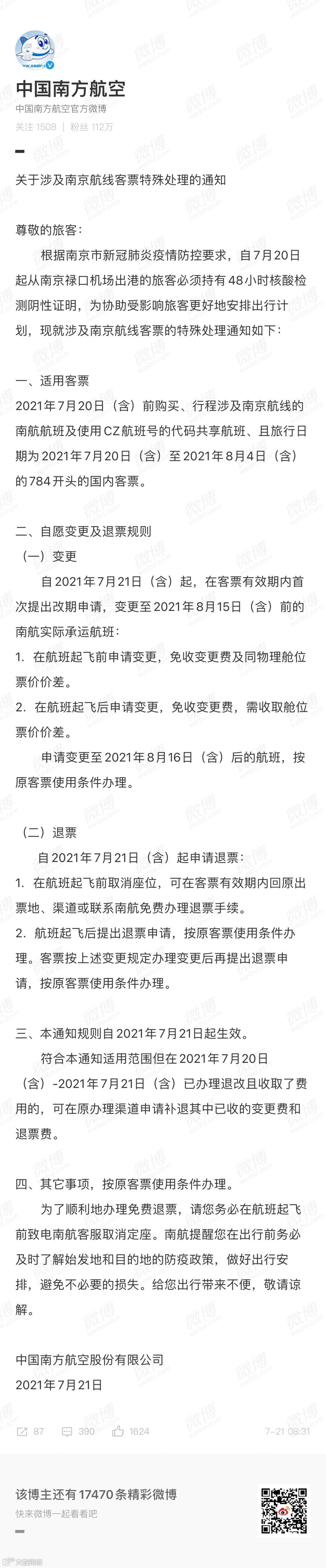 春秋航空21日表示,2021年7月21日(含)前购买,且乘机日期在2021年7月21(含)至2021年8月3日(含)之间,由春秋航空(9C)实际承运的南京进出航班,如选择变更至2021年8月10日(含)前由春秋航空承运的后续同航线航班,免收变更费和票价差;如选择退票,免收退票手续费。