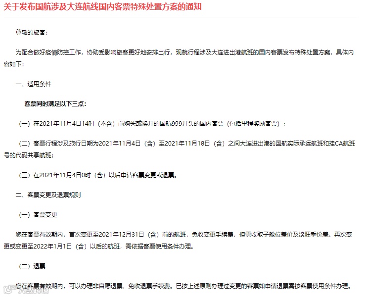 为配合做好疫情防控工作,现国航就行程涉及大连进出港航班的国内客票发布特殊处置方案,具体内容如下: