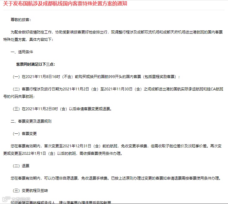 为配合做好疫情防控工作,国航已发布调整行程涉及成都双流机场和成都天府机场进出港航班的国内客票特殊处置方案,具体内容如下:
