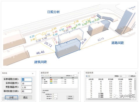 分析模块,拥有包含日照因素在内的间距排布功能,可同步动态调整建筑与建筑、建筑与道路、建筑与各类红线之间间距,实现建筑的规范布局。