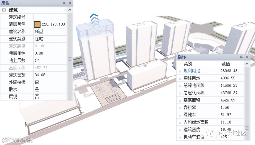 可实时读取dwg构建建筑、道路等专业要素,在模型与属性指标同步互动过程中确定建设强度。