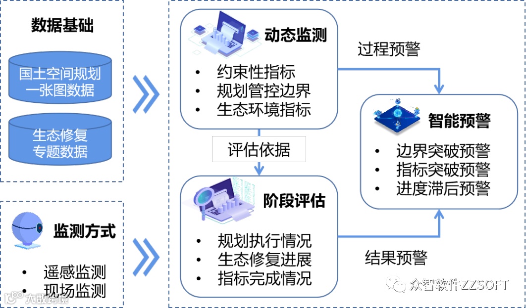 建立生态修复体征监测指标体系,通过现场监测、遥感监测等方式,对生态修复指标与行为进行动态监测;开展阶段性评估,对不合规之处智能预警;通过掌握生态现状,监控生态修复进度,为全程智治提供现实依据。