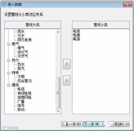将用户数据中管线管点的属性字段与程序关键属性字段进行匹配导入,生成对应类别的管线 管点。导入流程分为四步,分别为:选取数据、设置大小类对应关系、匹配程序关键字段、入库。