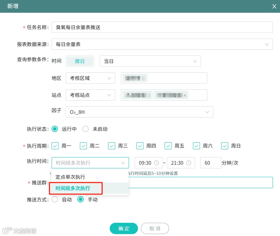 以【臭氧每日余量表推送】设置为例,按需设置好查询参数条件、执行周期、执行时间、推送群、推送方式等。