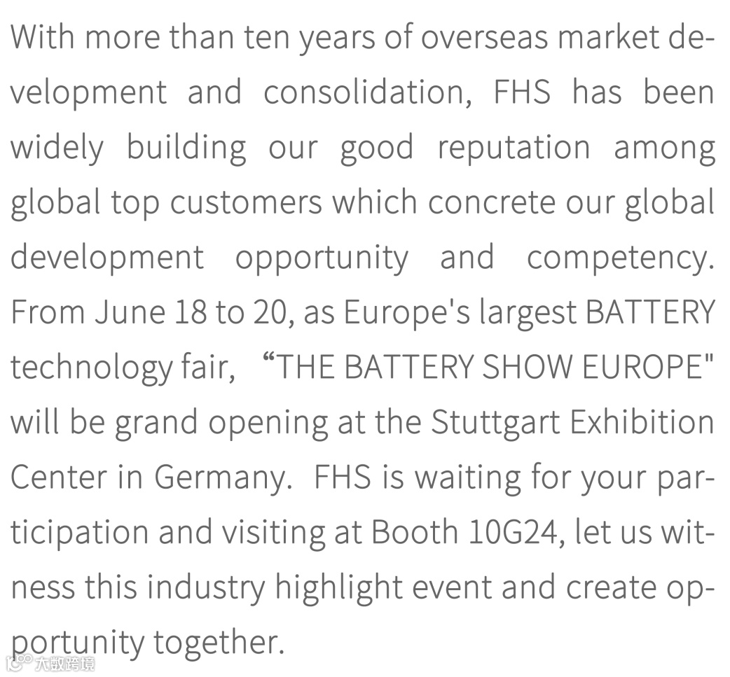 近年来,烽禾升集团不断夯实海外市场版图,凭借十余年的海外交付经验,逐步累积交付优势,国际化竞争优势凸显。6月18日至20日,作为欧洲最大的电池技术博览会,“2024年欧洲电池展及电动车科技展THE BATTERY SHOWEUROPE”将在德国斯图加特展览中心盛大开幕。烽禾升集团诚邀海内外新老客户莅临烽禾升展位(10G24)参观交流,深入探讨新能源尖端技术,共拓更大市场空间。