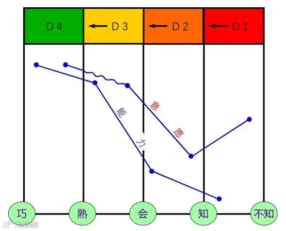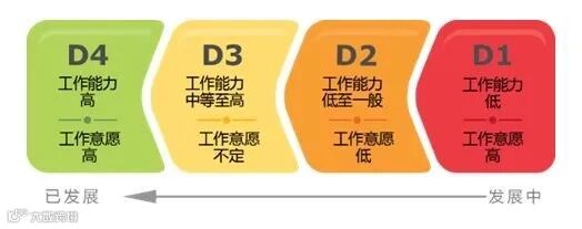 针对具体的工作目标或任务,以及员工的工作能力和工作意愿,诊断出四个员工不同的发展阶段: