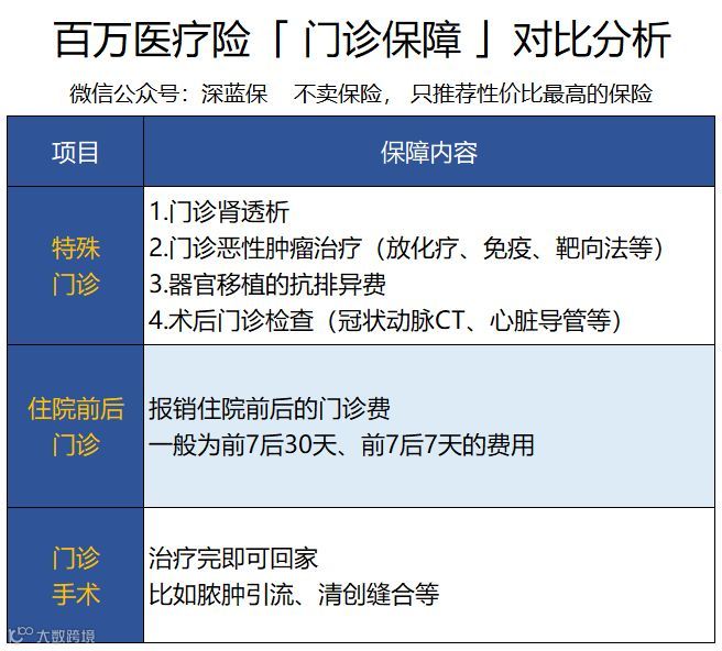 深蓝君之前推荐的百万医疗险,是应对高额医疗支出最有利的武器,虽然它们不涵盖普通门诊,但是一般以下几类特殊门诊都能报销:
