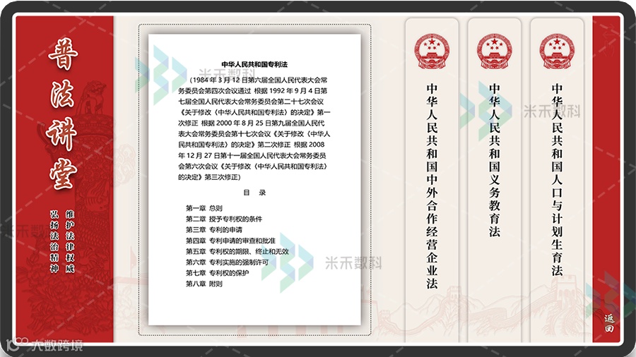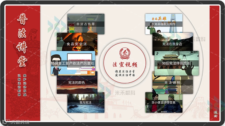 普法讲堂宣传屏是米禾数字首批推出的普法宣传互动设备。普法讲堂展览软件主要包含了法宣视频、普法连环画和法律阅读三块内容,通过视频、连环画和电子阅读的形式向观众深入生动地展示了法律在生活中的应用。