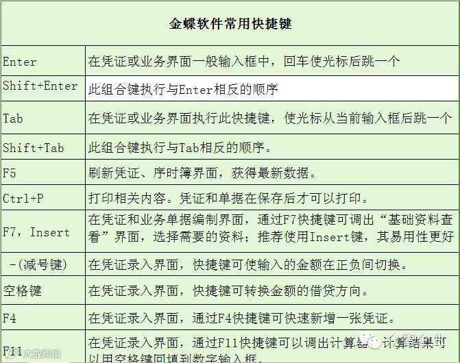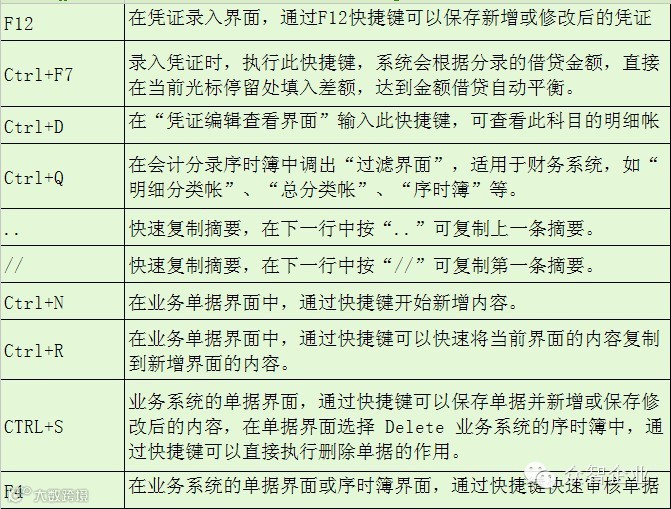 今天收录的快捷键,乍看好像很多不太容易记的样子,但其实,只要您平时用软件的时候,把微信调出来,对照着用个两三遍,不出一周时间你就离不开这些快捷键啦!虽然说是金蝶软件的常用快捷键,但其实有些按钮是通用的,不管是在制作EXCEL表格时,还是使用金蝶软件时,有些快捷键照样好用!您不妨试试!