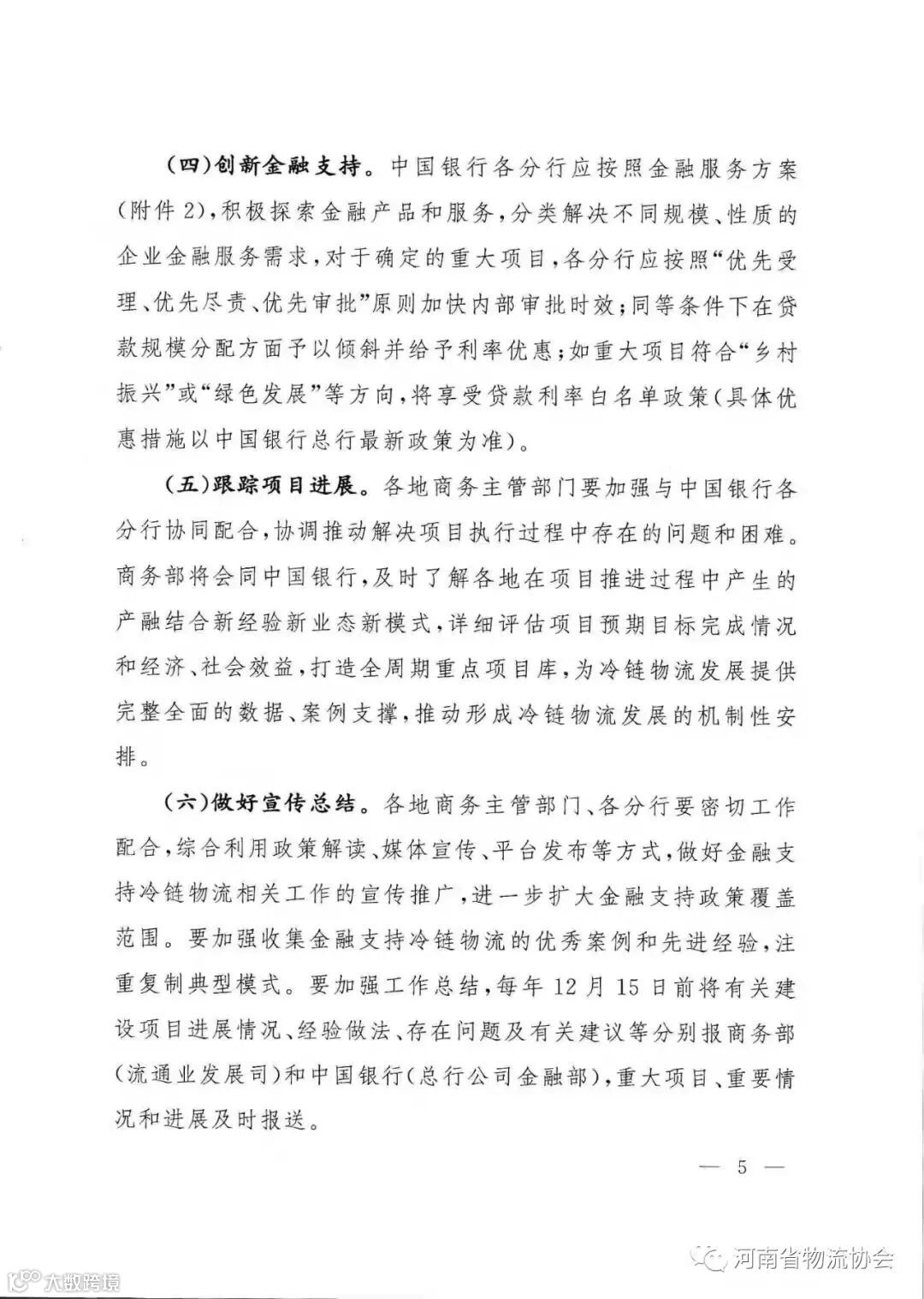 (五)跟踪项目进展。各地商务主管部门要加强与中国银行各分行协同配合,协调推动解决项目执行过程中存在的问题和困难。商务部将会同中国银行,及时了解各地在项目推进过程中产生的产融结合新经验新业态新模式,详细评估项目预期目标完成情况 和经济、社会效益,打造全周期重点项目库,为冷链物流发展提供完整全面的数据、案例支撑,推动形成冷链物流发展的机制性安排。