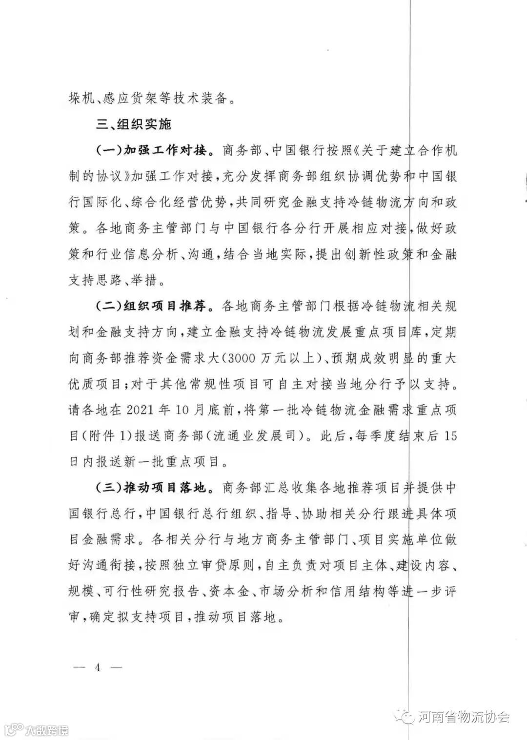 (二)组织项目推荐。各地商务主管部门根据冷链物流相关规划和金融支持方向,建立金融支持冷链物流发展重点项目库,定期向商务部推荐资金需求大(3000万元以上)、预期成效明显的重大优质项目;对于其他常规性项目可自主对接当地分行予以支持。请各地在2021年10月底前,将第一批冷链物流金融需求重点项 目(附件1)报送商务部(流通业发展司)。此后,每季度结束后15 日内报送新一批重点项目。