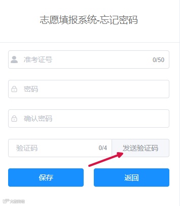 输入准考证号,新密码输入两次后,点击“发送验证码”按钮,下方显示的手机号中会收到一条验证码短信,输入短信中的验证码,然后点击“保存”按钮,提示密码修改成功。