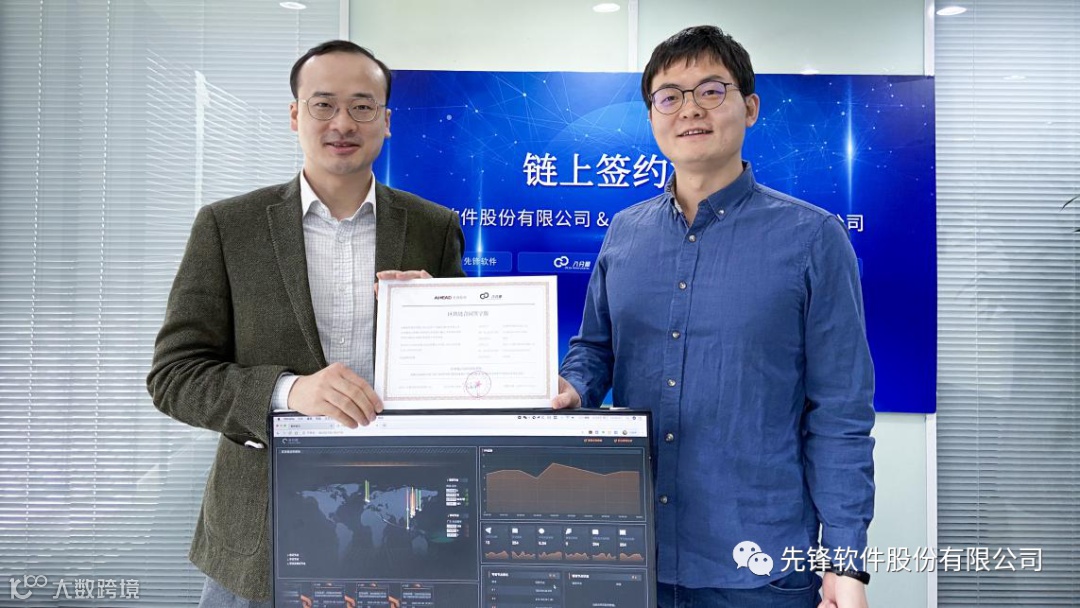先锋软件董事长陈苏与八分量董事长阮安邦分别代表双方进行链上签约。本次链上签约由国内及全球13地节点提供区块链验证和存证,合同内容哈希值、签署文件视频哈希值等写入区块链,作为创始区块。合同后续的合作和补充内容、业务文件、资金往来等生成新的区块,并陆续写入区块链账本,作为业务共识和存证。