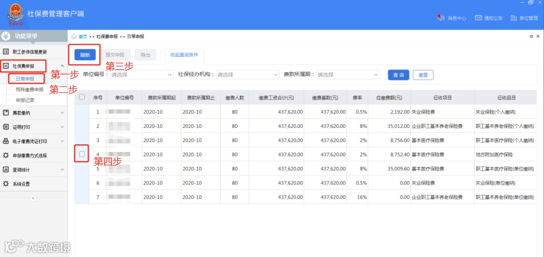 【社保费申报】-【日常申报】,点击“刷新”,系统更新申报数据,确认申报信息无误后,勾选需申报数据,点击“提交申报”。