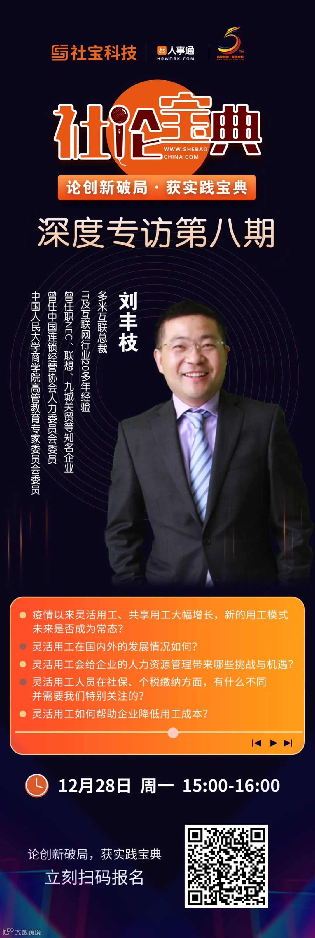 同时,本期社论宝典还邀请了多米互联总裁刘丰枝,和大家聊一聊灵活用工在社保、个税缴纳方面,有什么不同并需要我们特别关注的?以及如何帮助企业降低用工成本?12月28日(周一)15:00-16:00,锁定直播间,扫码即可报名哦~