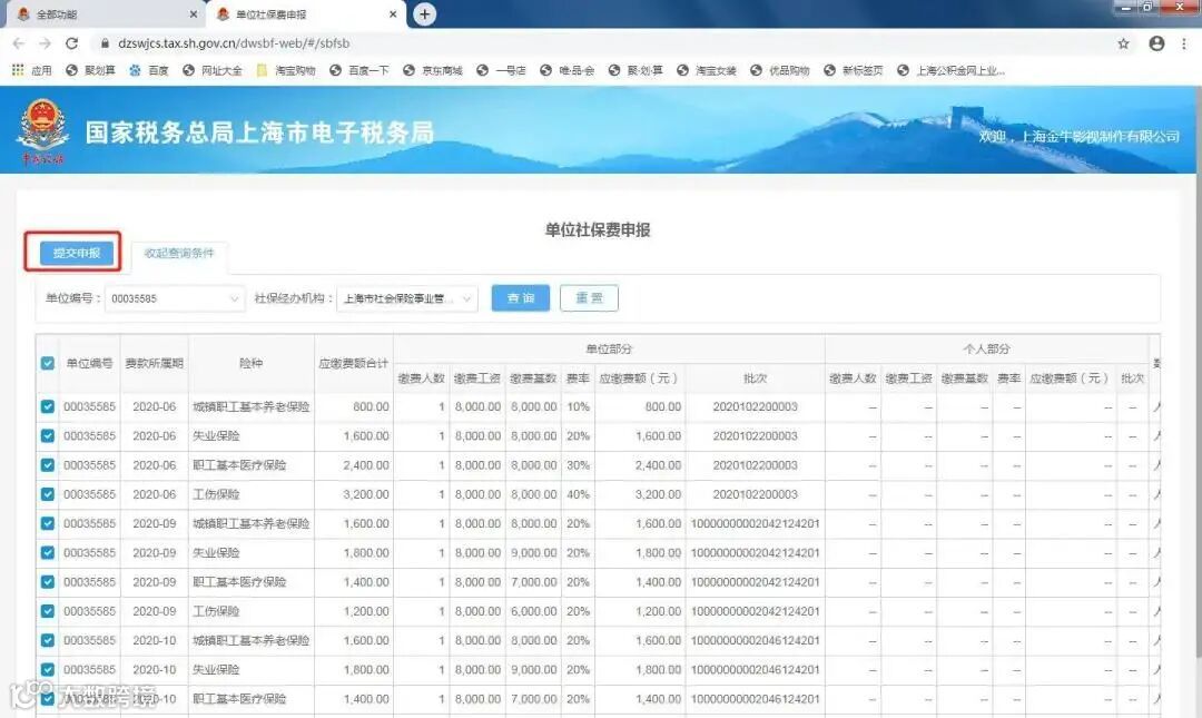 选择单位编号和社保经办机构,点击“查询”选中要申报的行次,核对无误后点击“提交申报”。