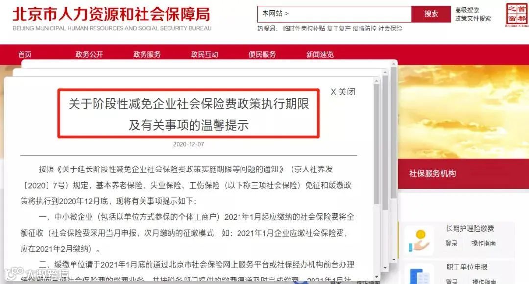 二、中小微企业(包括以单位方式参保的个体工商户)2021年1月起应缴纳的社会保险费将全额征收(社保保险费采用当月申报、次月缴纳的征缴模式,如:2021年1月企业应缴社会保险费,应在2021年2月缴纳)。