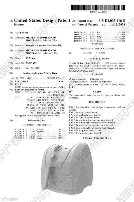 经查询,这款产品于2022年10月26日在美国进行外观专利申请的提交,于2024年7月2日获得了公告。