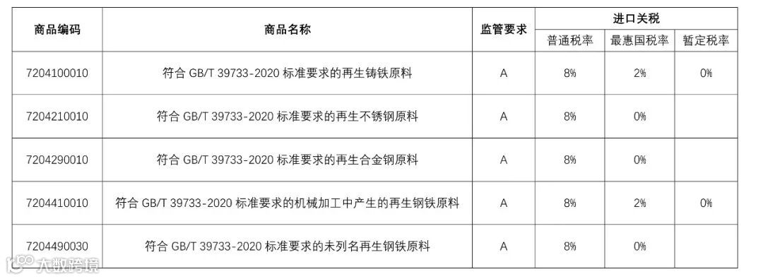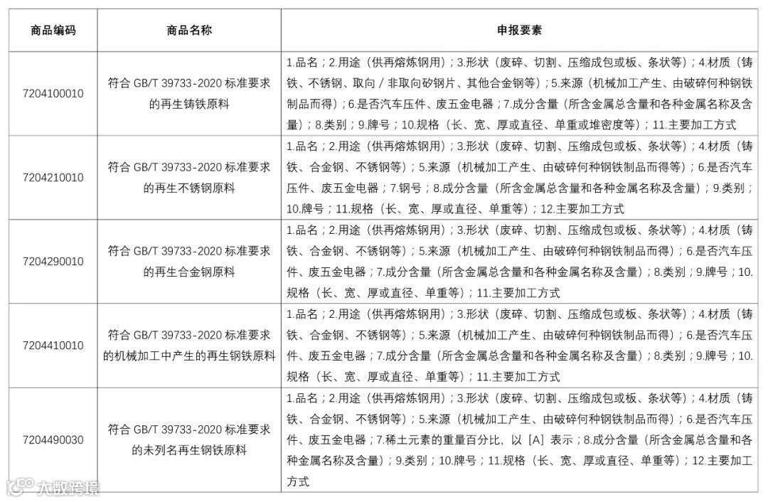 再生钢铁原料的商品编码分别为:7204100010、7204210010、7204290010、7204410010、7204490030。