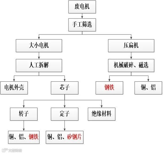 再生钢铁原料是由回收料经拆解、分拣、剪切、破碎、打包等分类及加工处理得到的炉料产品,以下为拆解的一般工艺流程举例。